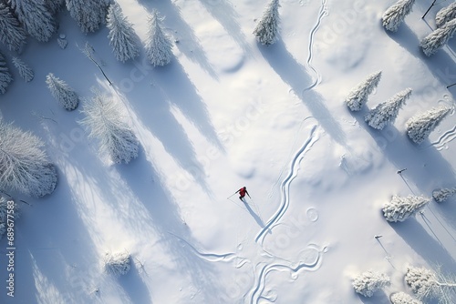 Aerial view of a snowy landscape with a single person skiing through untouched powder snow surrounded by heavily snow-laden trees