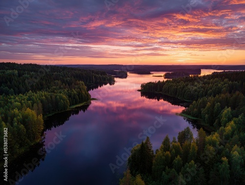 Aerial view of a tranquil lake at sunset, the vibrant colors of the sky reflected perfectly in the still water, surrounded by lush green forests