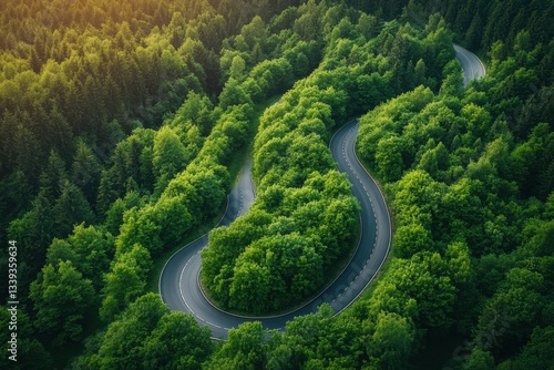 Aerial view of a winding road cutting through a lush green forest illuminated by golden sunlight creating a scenic landscape