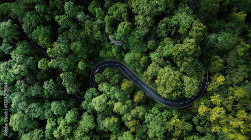 Aerial View of a Winding Road Cutting Through Lush Untouched Woodland Scenic Nature Landscape Vibrant Green Environment Bird's Eye Perspective Tranquil Wilderness Experience