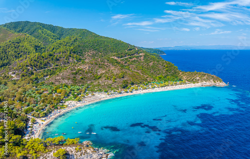 Aerial view of Armenistis Beach in Sithonia, Halkidiki, Greece.