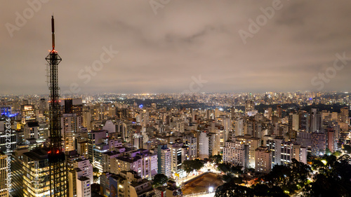 Aerial view of Av. Paulista in Sao Paulo, SP. Main avenue of the capital. Photo at night, with car lights.