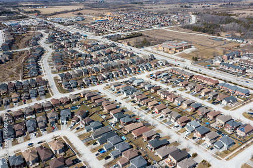 Aerial view of Barrie, Ontario, highlighting dense residential areas adjacent to the expansive, icy expanse of Lake Simcoe. The urban landscape showcases modern homes and infrastructure against a sere