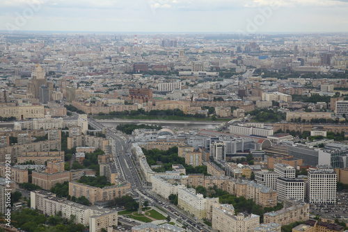 Aerial view of city Moscow in summer. Form from the observation platform of the business center of Federation Tower Moscow City. Photography from a height of 374 meters.