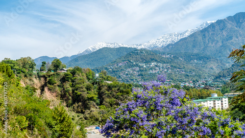 Aerial view of Dharamshala of Himachal Pradesh surrounded by cedar forests and Dhauladhar mountain range