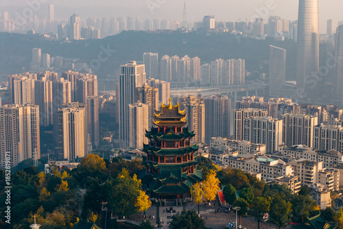 Aerial view of Hong'en Pavilion, a traditional Chinese pagoda, stands amidst a modern cityscape, with the soft morning light casting a golden glow over the scene, Chongqing, Hong’en Pavilion, China.