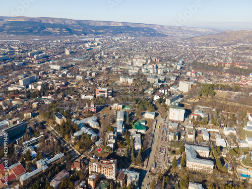 Aerial view of Kislovodsk with narzan gallery in sunny day, heath and ecological resotrt in Russia near Caucasus mountains