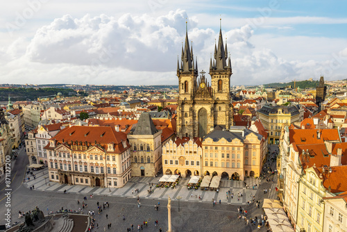 Aerial view of Old Town Square, a historic square in the Old Town quarter of Prague, Czech Republic with the Church of the Mother of God before Týn
