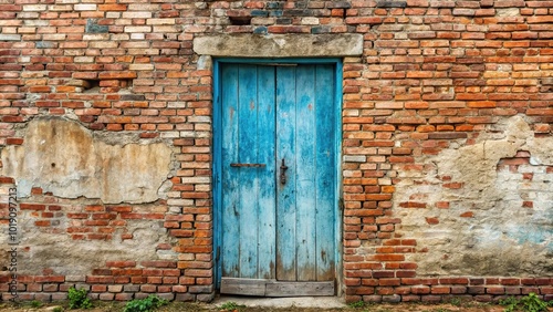 Aerial view of rustic brick wall with weathered blue wooden door