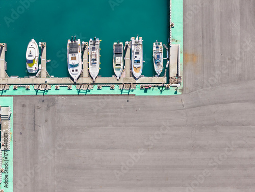 Aerial View of Several Yachts Docked at a Modern Pier