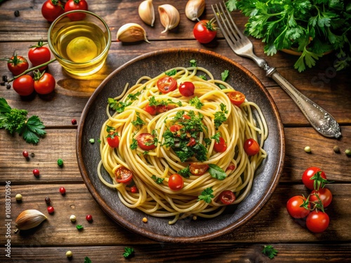 Aerial View of Spaghetti Aglio e Olio Garnished with Fresh Parsley, Perfect for Italian Cuisine Lovers and Food Photography Enthusiasts