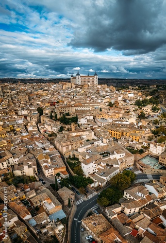 Aerial view of the Alcázar standing tall above the ancient city with its terracotta roofs under a dramatic sky, Toledo, Castile-La Mancha, Spain.