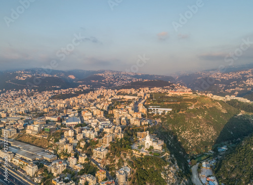 Aerial view of the Christ statue in Keserwan District, Beirut, Lebanon.