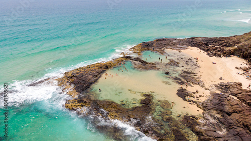 Aerial view of the contrasting turquoise water meeting the rugged, rocky coastline of Champagne Pools, Champagne Pools, Queensland, Australia.