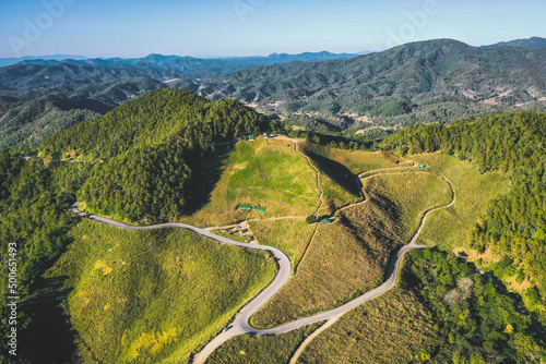 Aerial view of Thung Bua Tong Fields in Mae Hong Son, Thailand