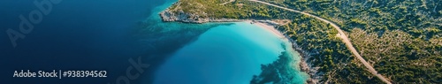 Aerial view of tranquil turquoise waters and lush coastline at sunrise