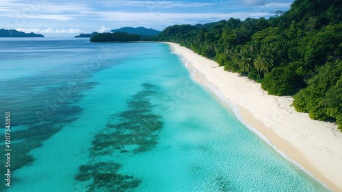 Aerial view of tropical beach with turquoise sea white sand and green forest