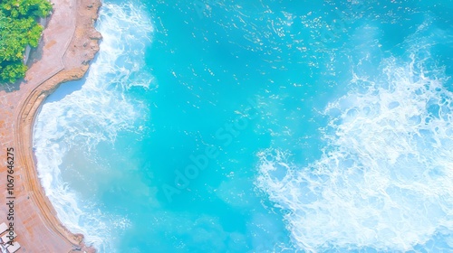 Aerial view of turquoise ocean waves crashing against a rocky shoreline.