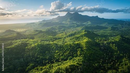 Aerial view of volcanic peaks towering above verdant tropical forests in Tahiti with the ocean glimmering in the distance