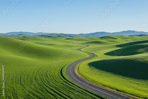 Aerial View of Winding Cypress-Lined Road Through Lush Green Fields Under Blue Sky