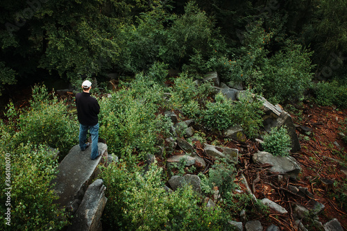 Aerial view to young man standing on stone in forest. Natural reserve javoricka vrchovina, dark mood green