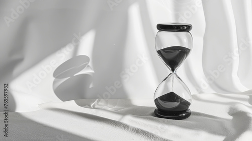 Aesthetic modern hourglass with black sand on a clean white background, copy space. Minimalist template. Generative AI