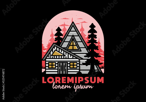 Aesthetic wood house between two pine tree illustration badge design
