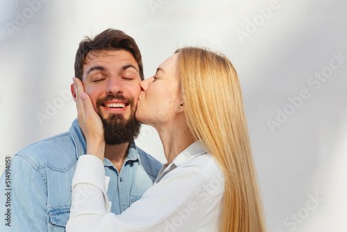Affectionate blond woman kissing man on cheek in front of wall