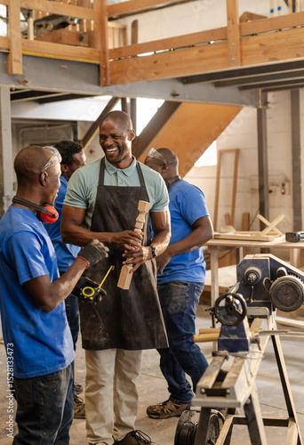 African American carpentry team laughing while holding carved spindle beside wood lathe at workshop
