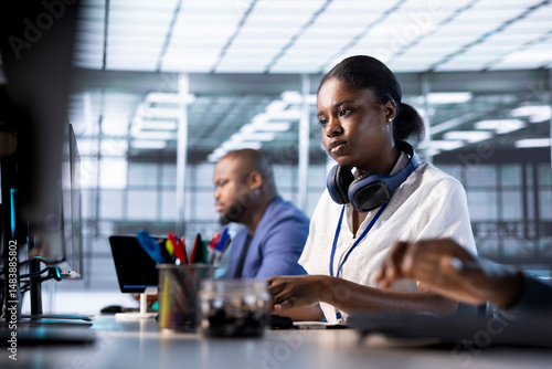 African american engineer next to coworkers in server farm checking recovery plan, monitoring data center energy consumption. Woman in server hub doing routine disk checks