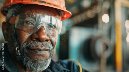 African American senior male industrial worker wearing safety gear in a factory. Concepts of elderly laborer, manufacturing, industry, occupational safety