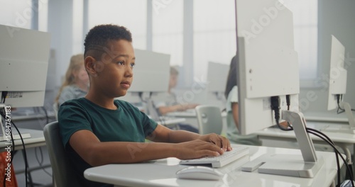 African American Smart Boy Using Computer, Doing Creative 3D Design Project. Teacher Helping Young Elementary School Student in Learning Coding During Digital Programming Lesson. Modern STEM Education