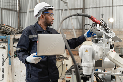 African American technician engineer man use laptop computer control with checking machine arm robot at factory