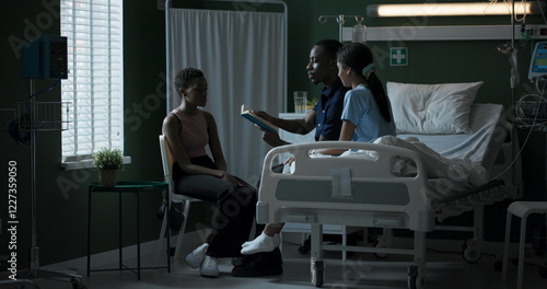 African father and child sit on a hospital bed reading a book together. A mother sits with her child, and the family spends time together while the child is recovering from a serious illness.