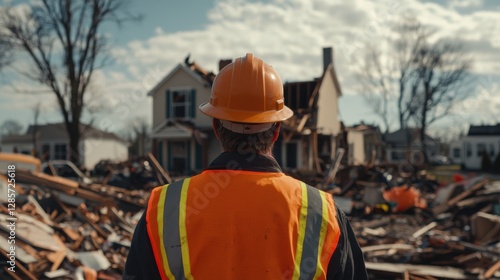 Aftermath Of Disaster Worker Surveys Damaged Structures And Debris