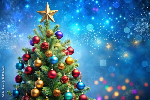 Against a vibrant blue backdrop, a majestic Christmas tree stands tall, its branches heavy with colorful ornaments and