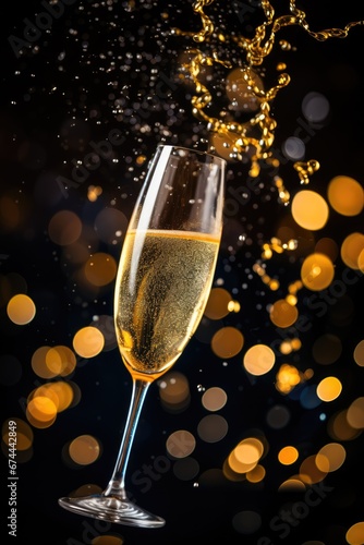 Against the background of confetti and lights, a glass of sparkling wine. Holiday concept