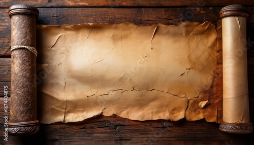 aged and weathered parchment scroll with torn edges resting on a rustic wooden surface