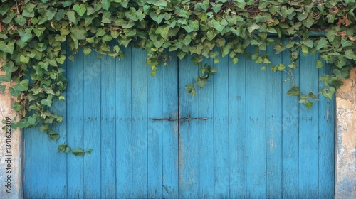 Aged Blue Wooden Door with Overgrown Ivy
