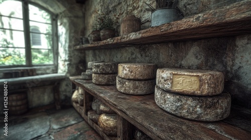 Aged cheeses on rustic wooden shelves in an old stone cellar with garden view