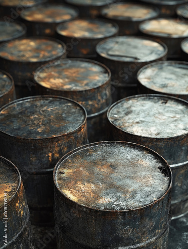 Aged metal barrels with rust, arranged in a pattern.