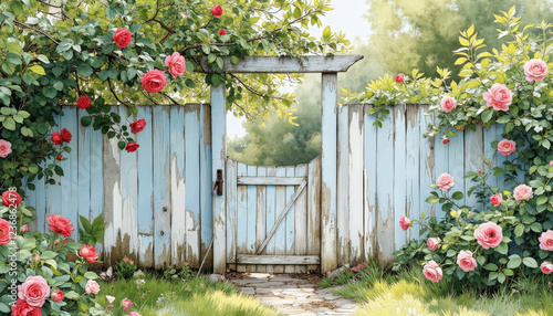 Aged wooden fence adorned with roses, serene garden gateway