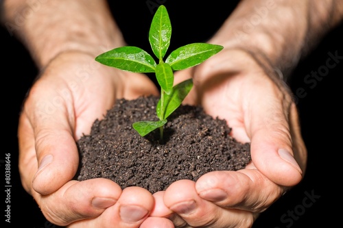 Agricultural. Hands holding green sprout with soil