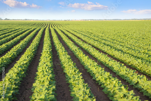 Agricultural soybean field. Landscape rural scene beautiful spring sunny day with blue sky and clouds