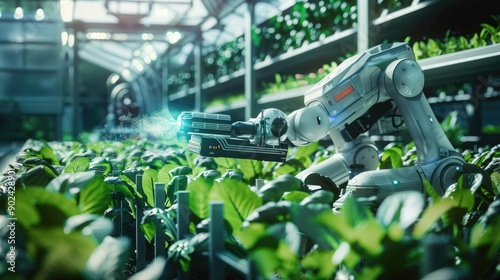 Agriculture futuristic. Pollinate of vegetables with robot automation. Detection spray chemical. Leaf analysis and foliar fertilization. Eliminate pests and provide essential
