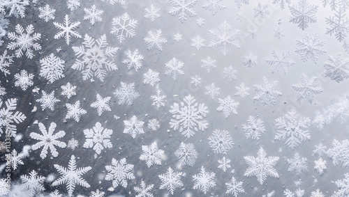 白い空に広がる多くの雪片が冬の寒さと静けさを表現する背景。生成AI