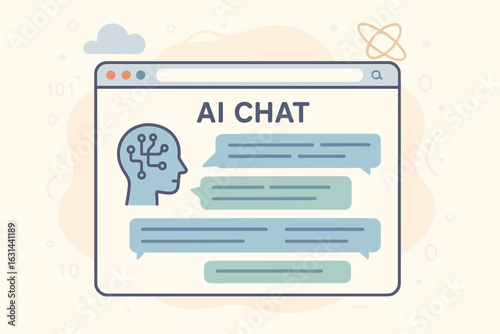AI chat bot conversation concept. Artificial intelligence chatbot in web browser window. Online virtual assistant, customer support service. Future technology vector illustration.