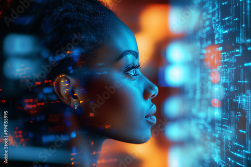 .AI cyber security threat, female african american IT specialist analysing futuristic holographic data information. blue & orange colour,