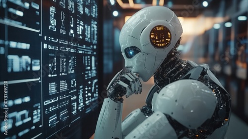 AI developing predictive models in a finance lab, futuristic stock market graphs.