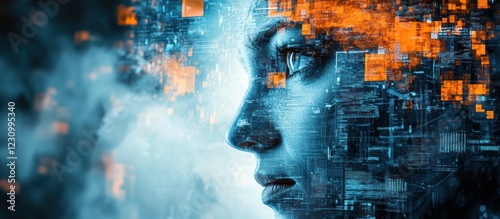 AI, digital, futuristic woman's profile with tech overlay.